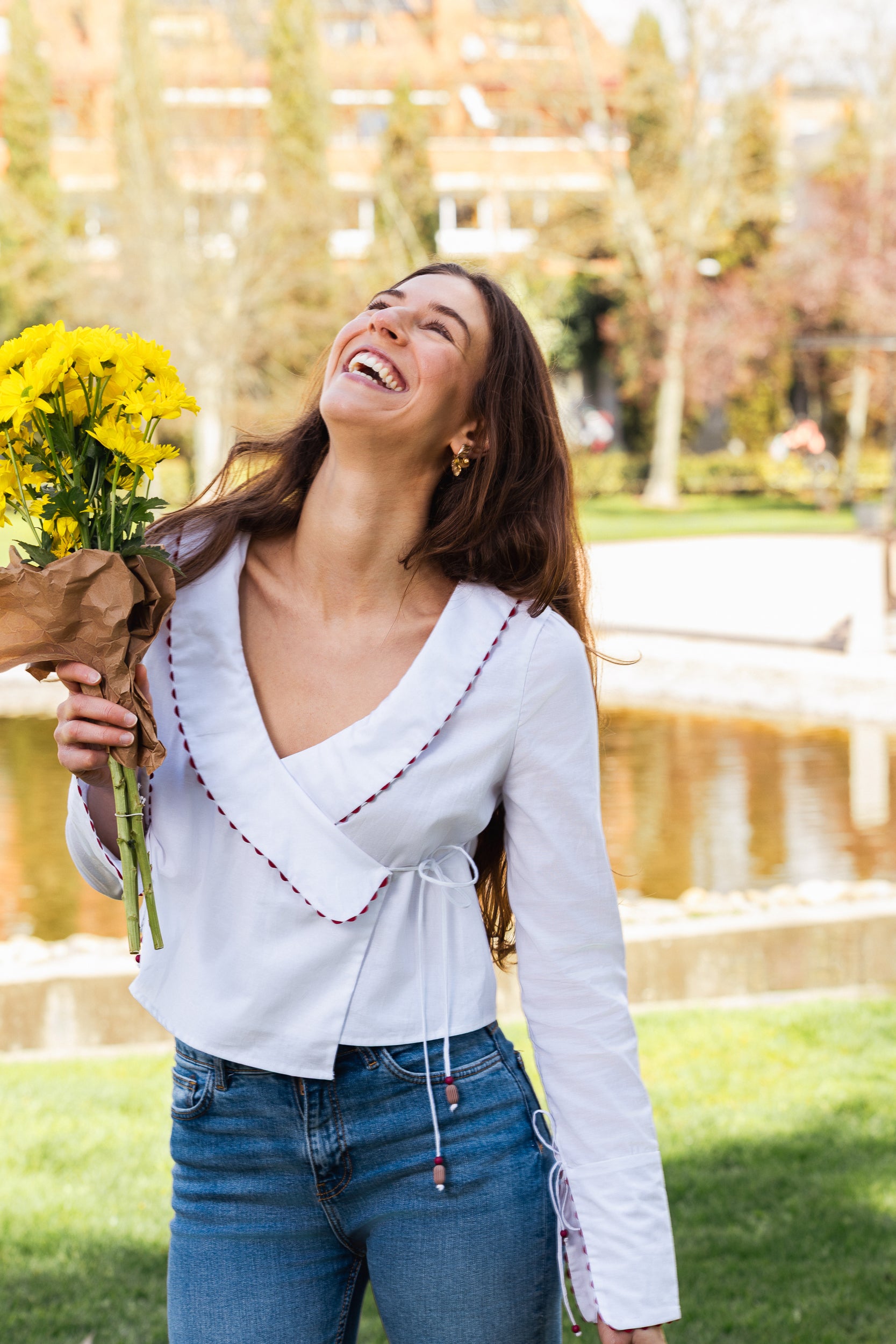 Cloe es una de esas prendas que te abrazan sin apretar, que hablan bajito pero llegan lejos. Su forma cruzada se adapta al cuerpo con gracia, mientras los pespuntes en rojo y los abalorios en los cordones le dan un aire especial, casi ritual.