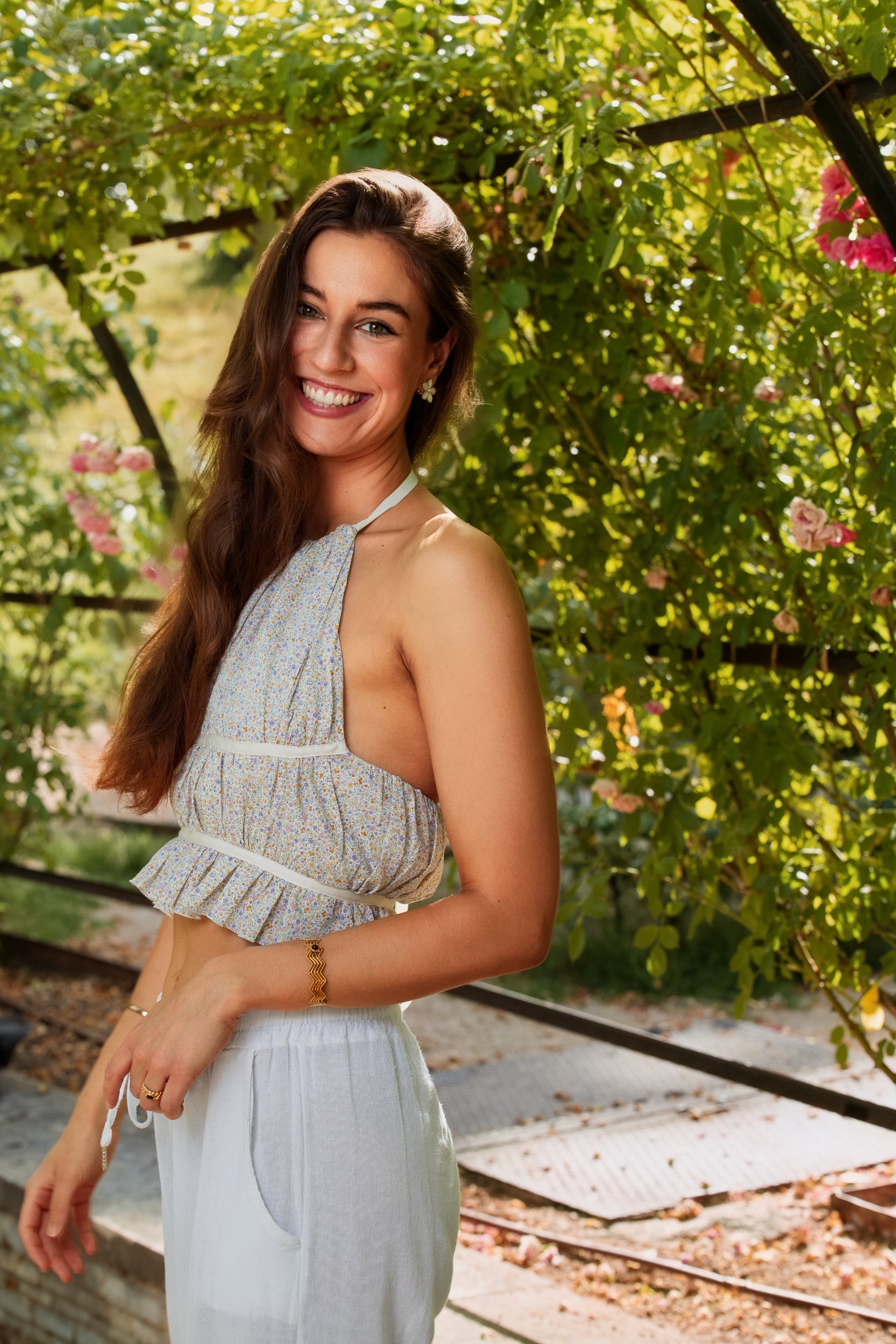 Es una blusa crop con escote halter que se anuda al cuello y a la espalda con cintas de algodón. Fruncida bajo el pecho y en la cintura, se ajusta a ti con delicadeza y termina con un pequeño volantito que le da movimiento y gracia 🌬️