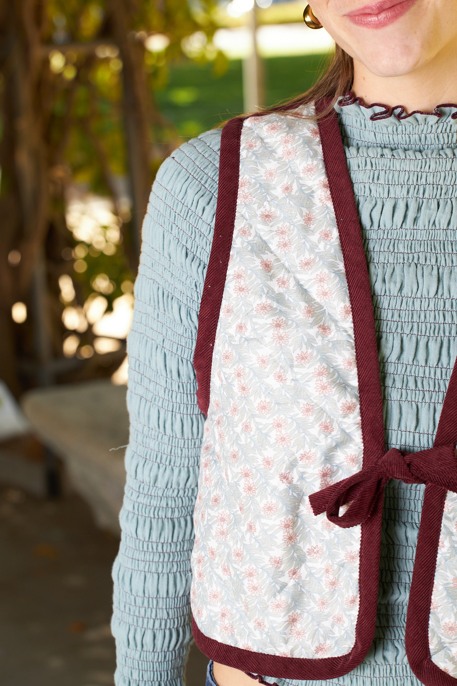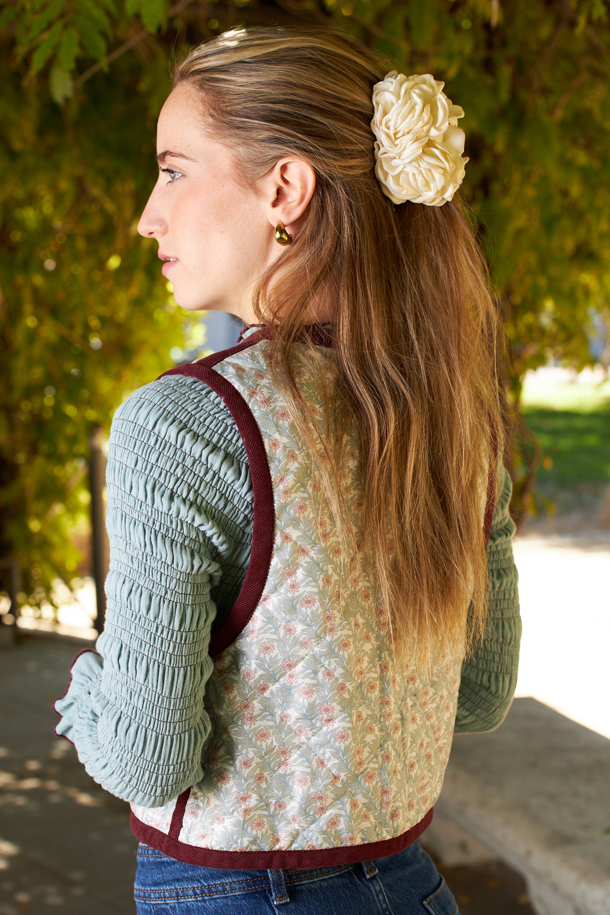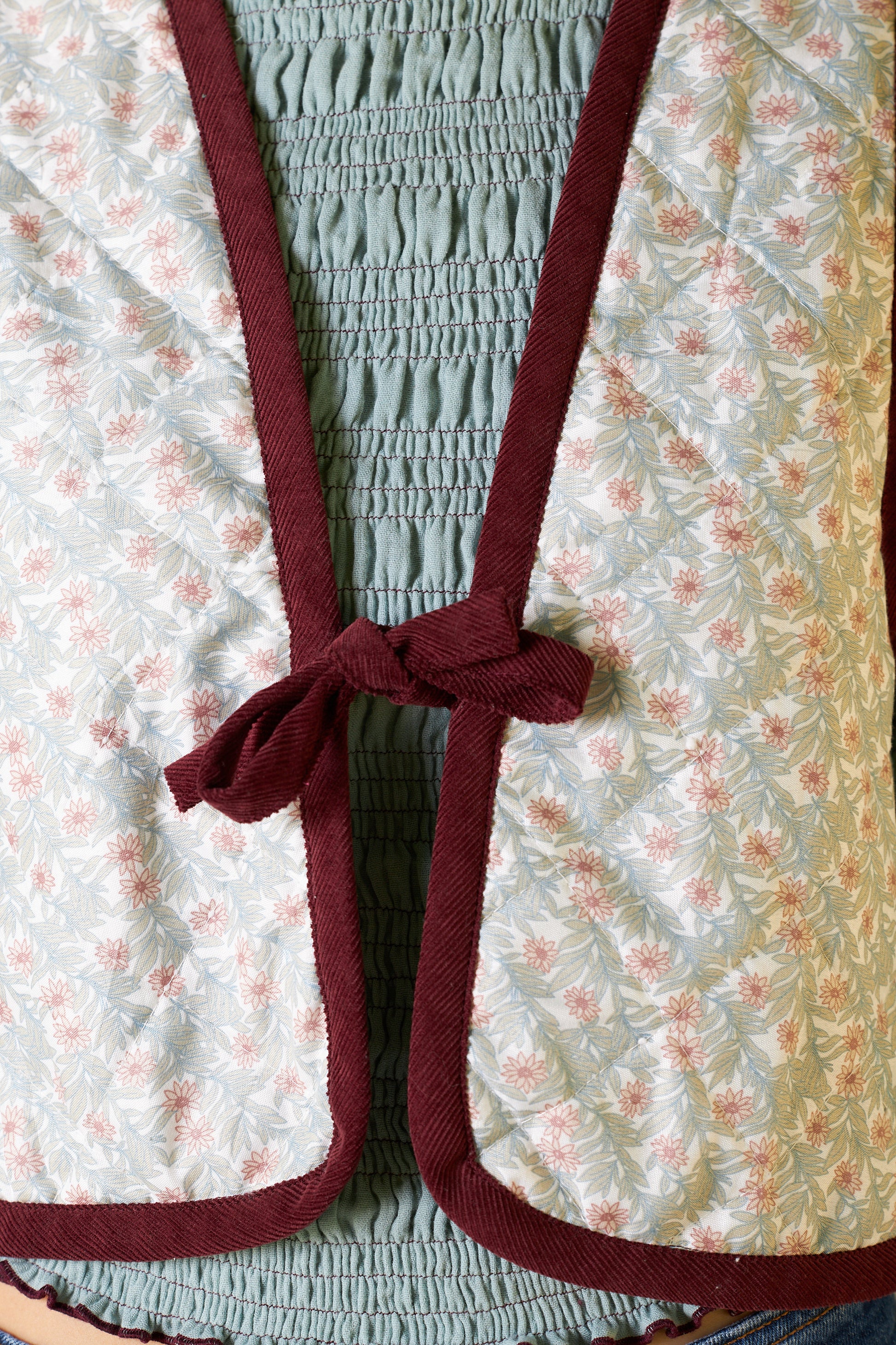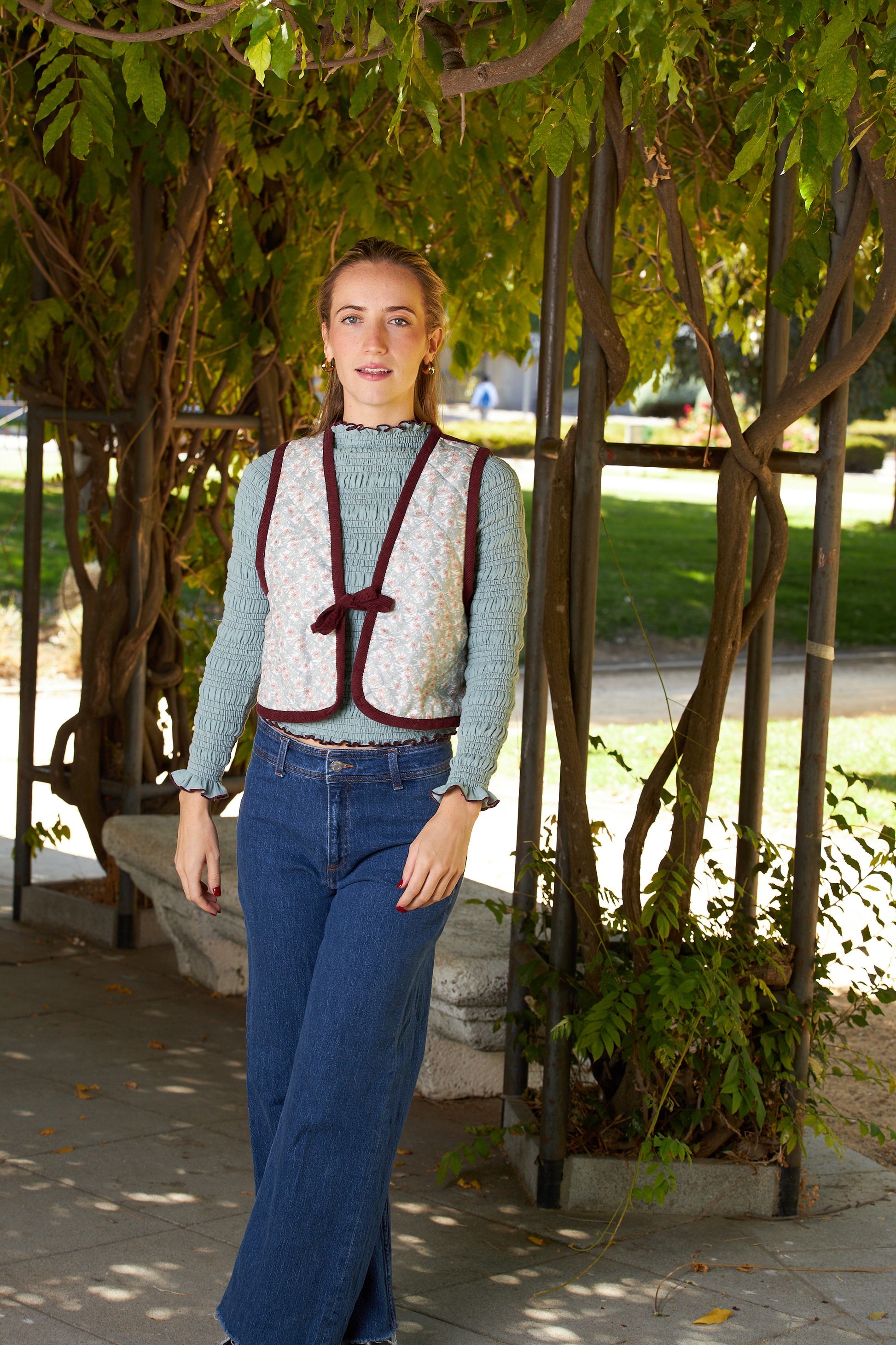 Una de esas piezas especiales que aportan un toque de encanto a cualquier look. El Chaleco Patio está confeccionado a mano en nuestro taller con una colcha en desuso de estampado floral y tonos suaves, rematado con un vivo color burdeos que lo enmarca y le da personalidad.