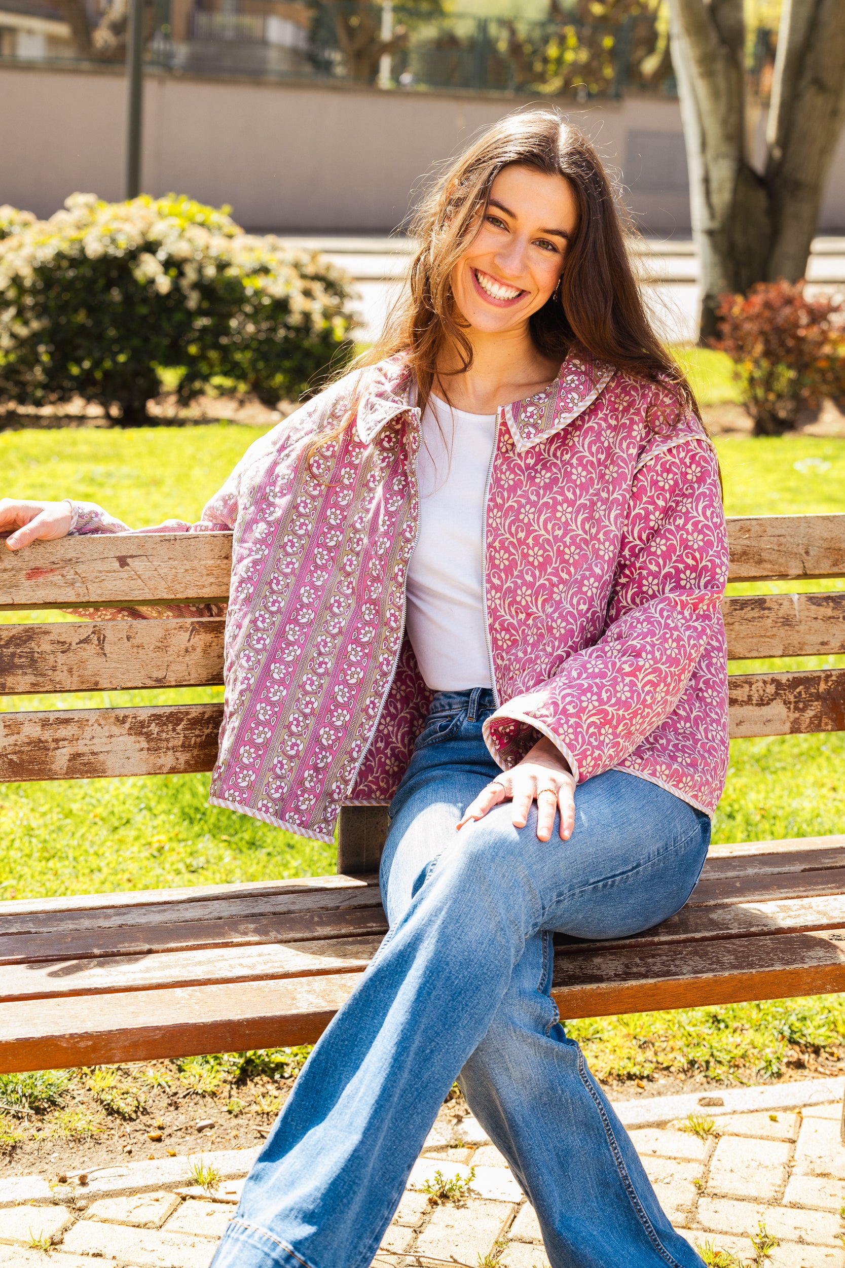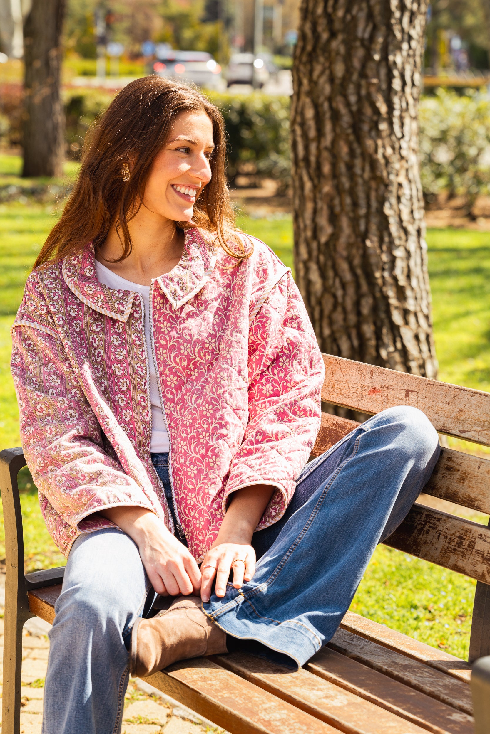 Maranta es una chaqueta que abraza. Su mezcla de estampados en tonos rosa empolvado y beige evoca flores antiguas, jardines tranquilos y el valor de lo hecho con calma. Está confeccionada a partir de una colcha vintage, transformando pasado en presente con cada puntada.