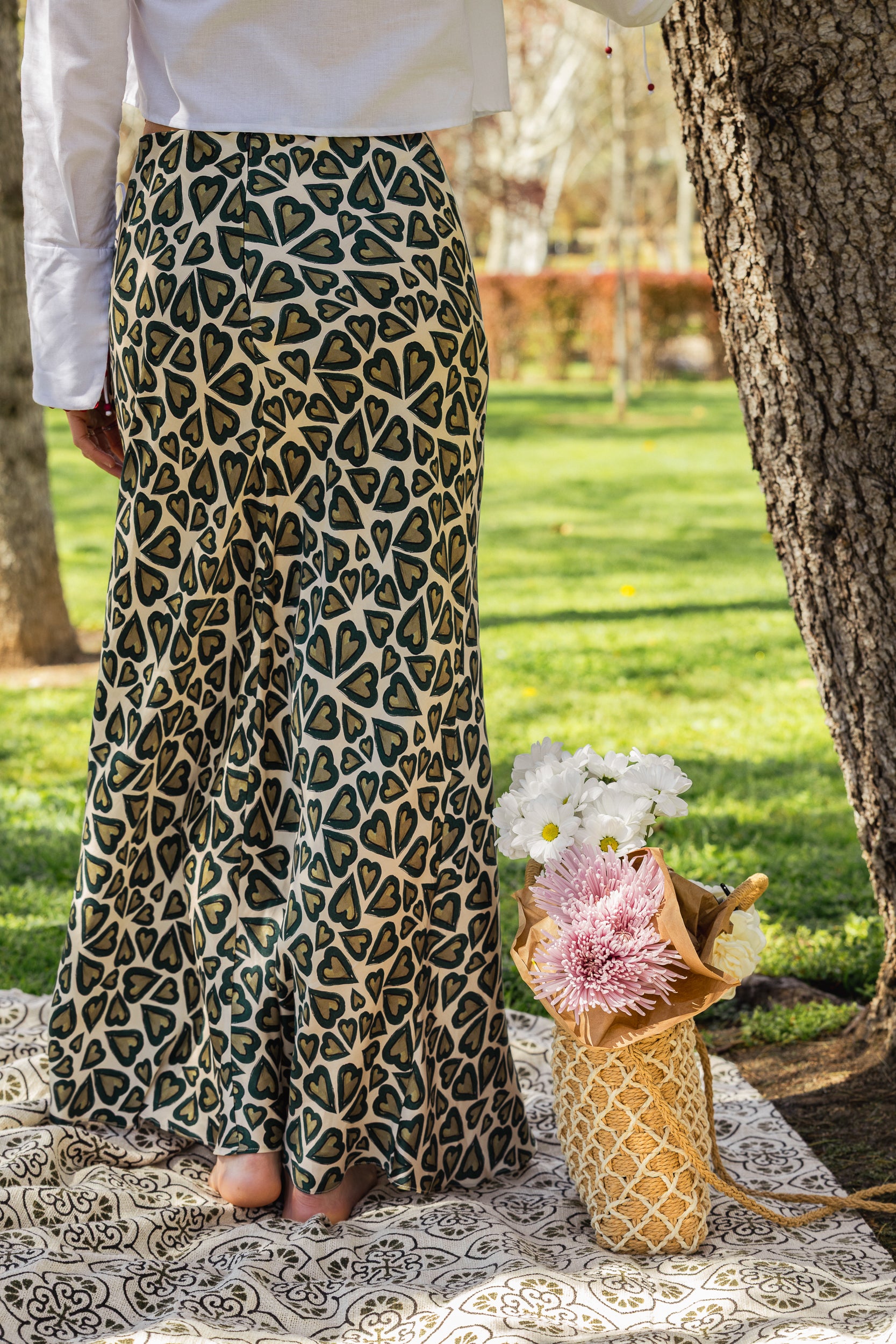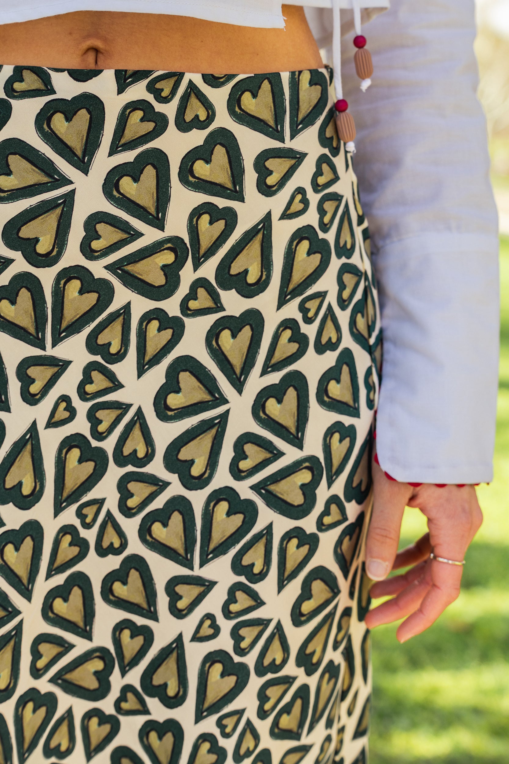 Silva es una de esas piezas que parecen hechas para bailar con el viento. Su corte al bies dibuja la silueta con fluidez y elegancia, mientras su estampado de corazones, entre lo botánico y lo simbólico, nos recuerda que el amor también puede ser verde, crudo y sereno.