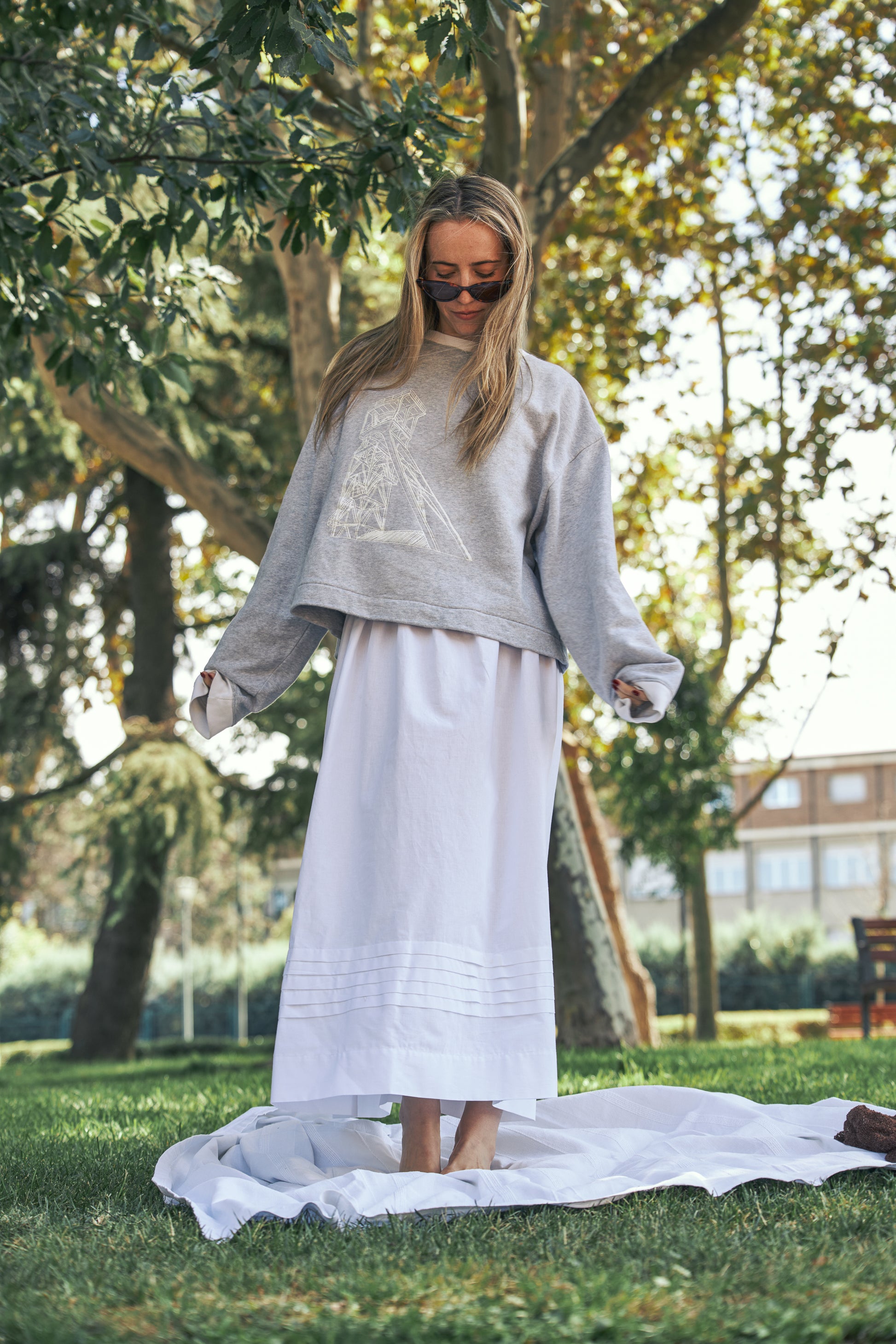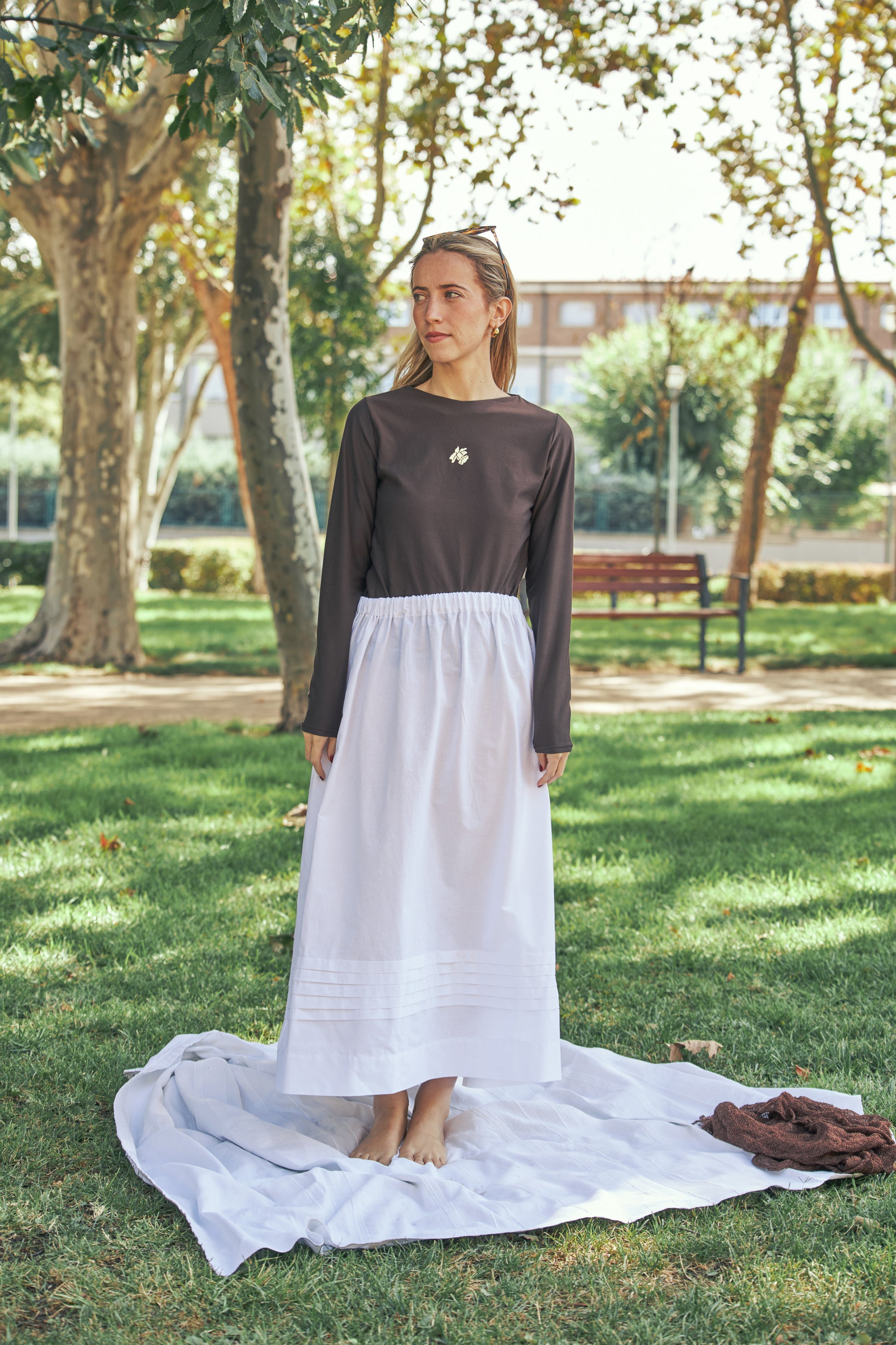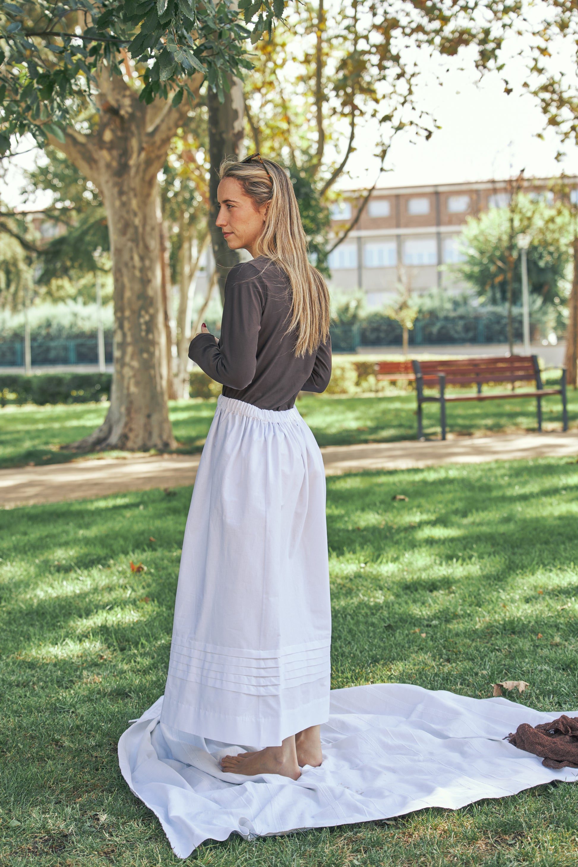 De color blanco puro, es una falda que transmite serenidad y luz, y que se adapta a cualquier estación y momento. Una pieza esencial que dialoga con la naturaleza y con la historia de los pueblos que inspiran esta colección.