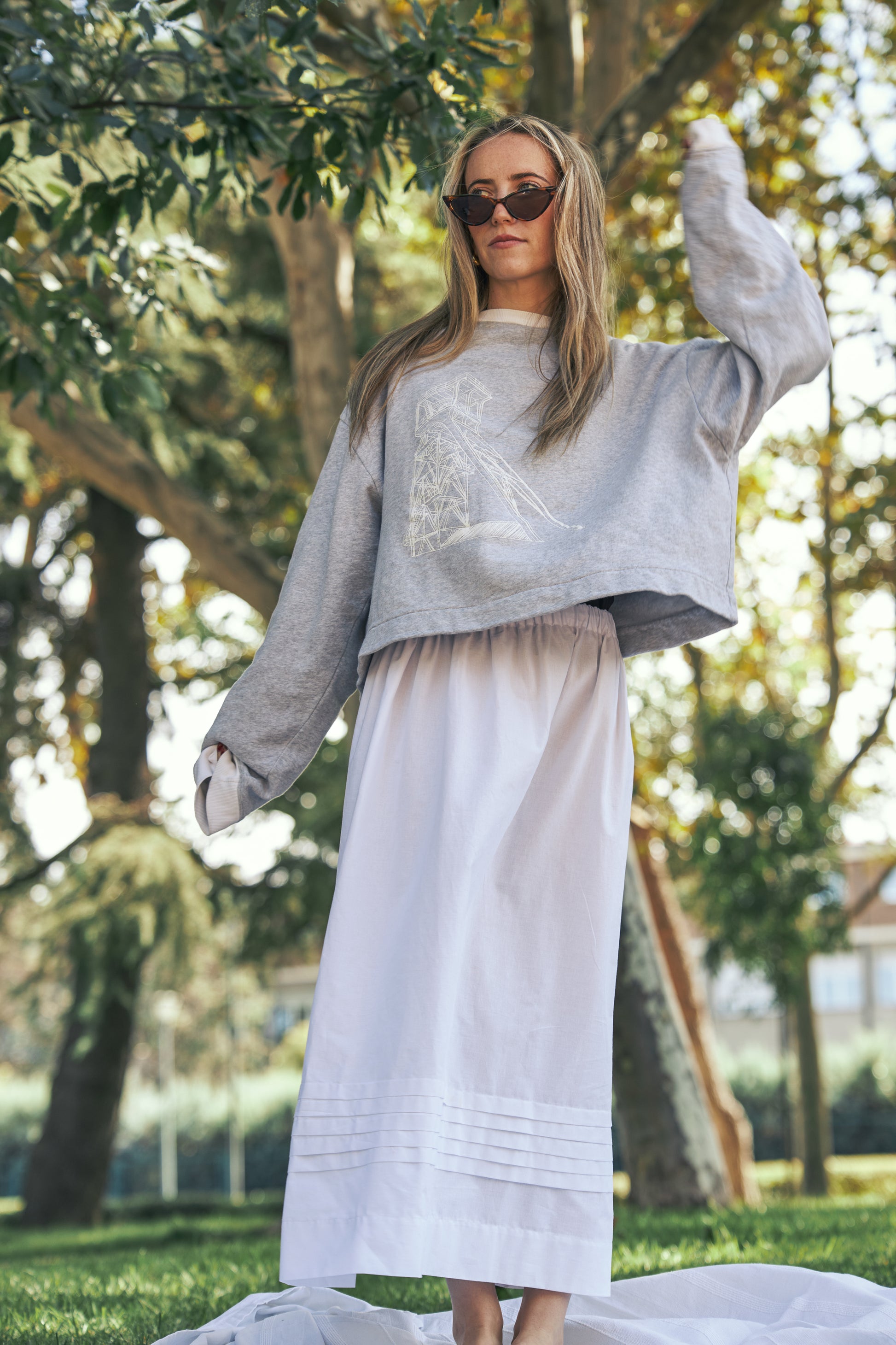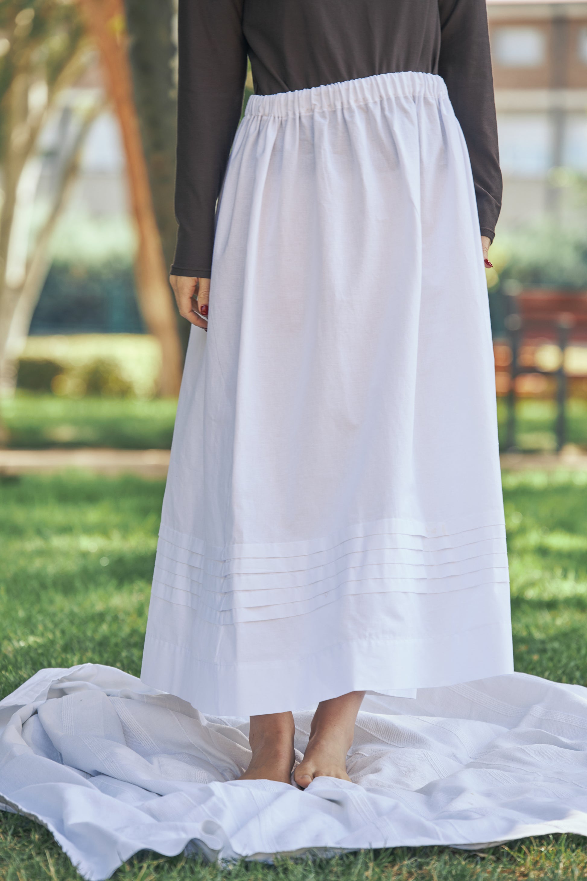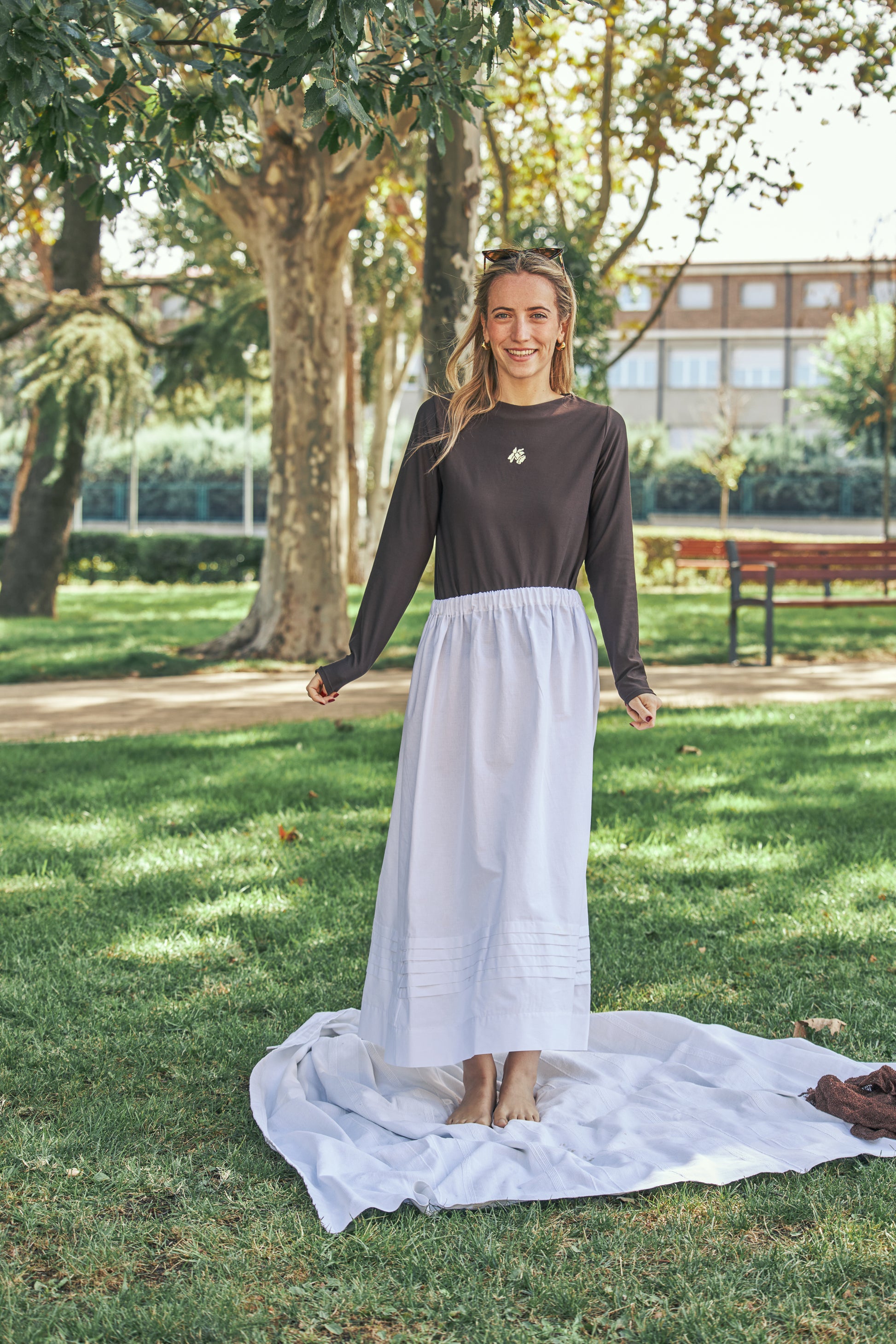 De color blanco puro, es una falda que transmite serenidad y luz, y que se adapta a cualquier estación y momento. Una pieza esencial que dialoga con la naturaleza y con la historia de los pueblos que inspiran esta colección.