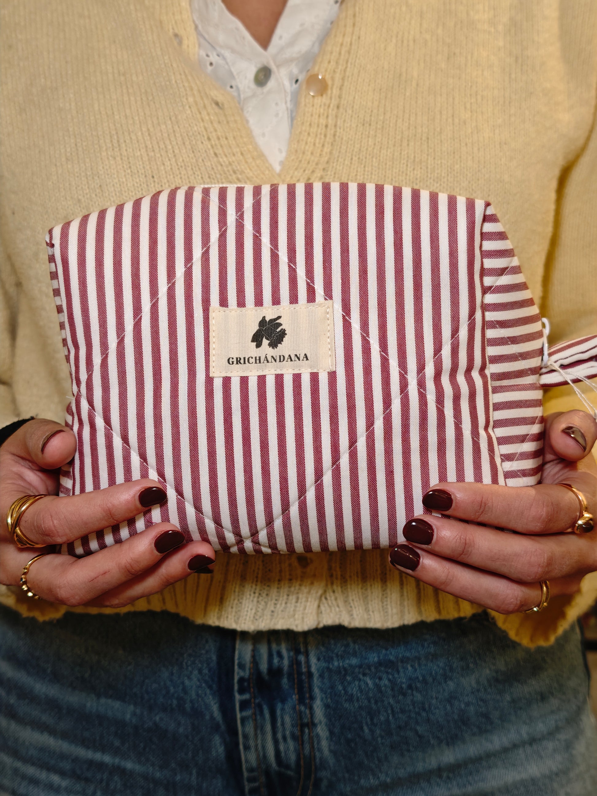 *los neceseres de rayas granates y blancas tienen cremallera granate o cremallera blanca, si tienes preferencia por alguno de los dos colores, indícanoslo en las notas del pedido.